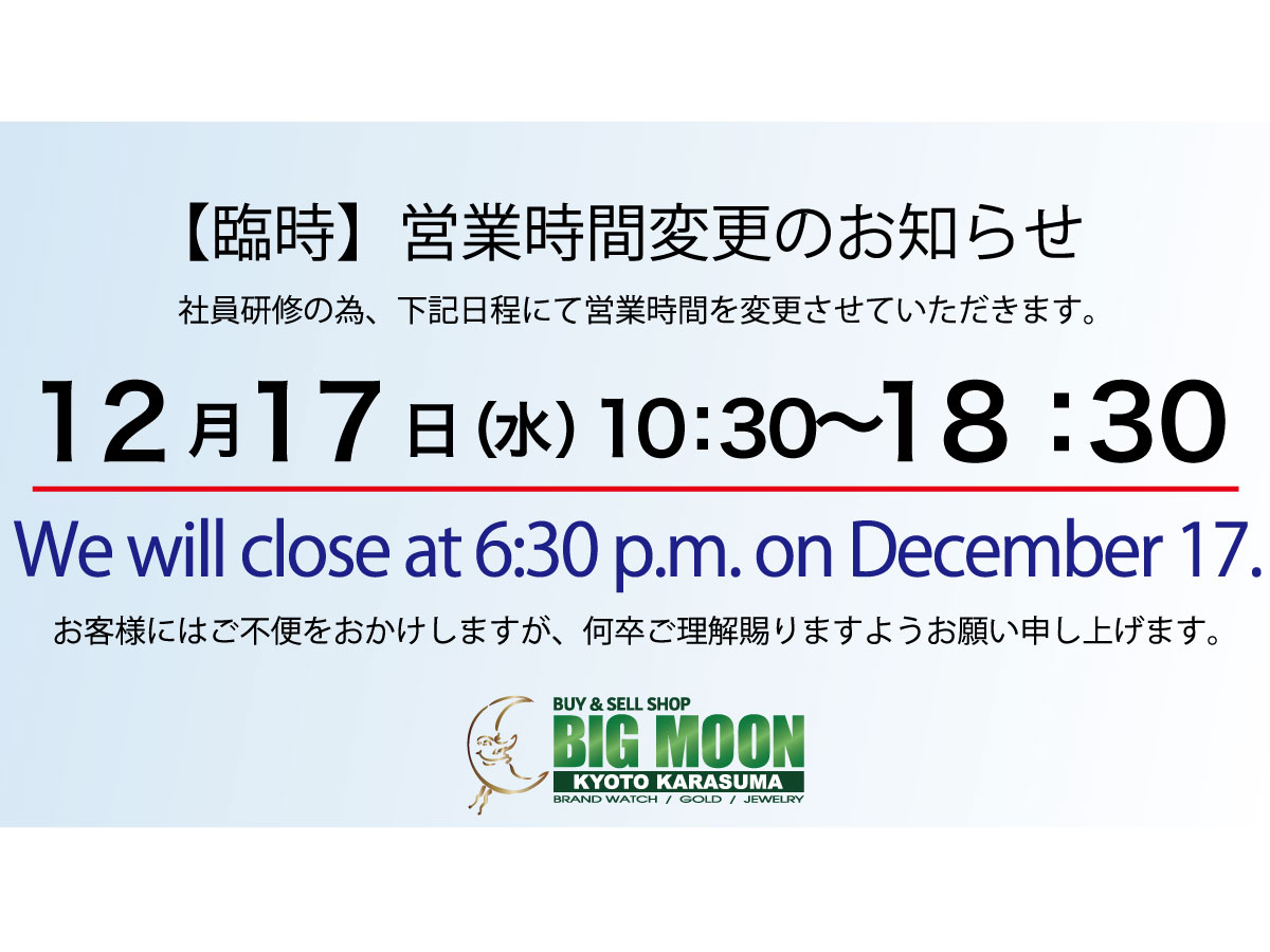 社員研修に伴い、12月17日(水)の営業時間を下記の通り短縮させていただきます。